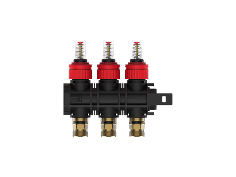 Колекторот има интегрирани фловметри на доводот, кои овозможуваат прецизна контрола и мерење на протокот во секоја зона. На повратниот дел е предвидено место за термоактуатор, што овозможува автоматско отворање и затворање на круговите според температурата во просторот. Телото е изработено од висококвалитетен PA12 и PA6.6 со 30% стаклени влакна, со месинг приклучоци и EPDM заптивки, гарантирајќи долготрајна издржливост и отпорност на високи температури и притисоци.
